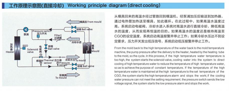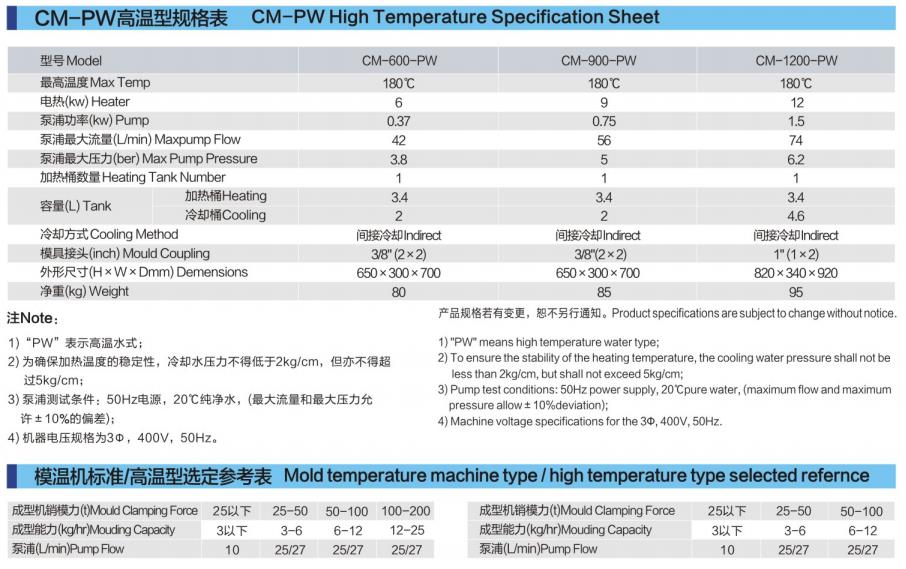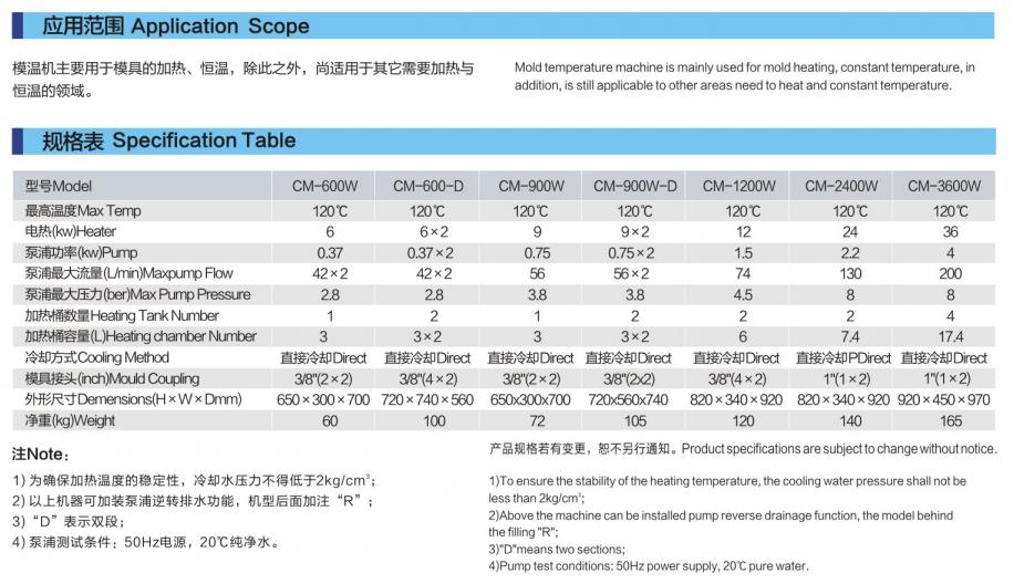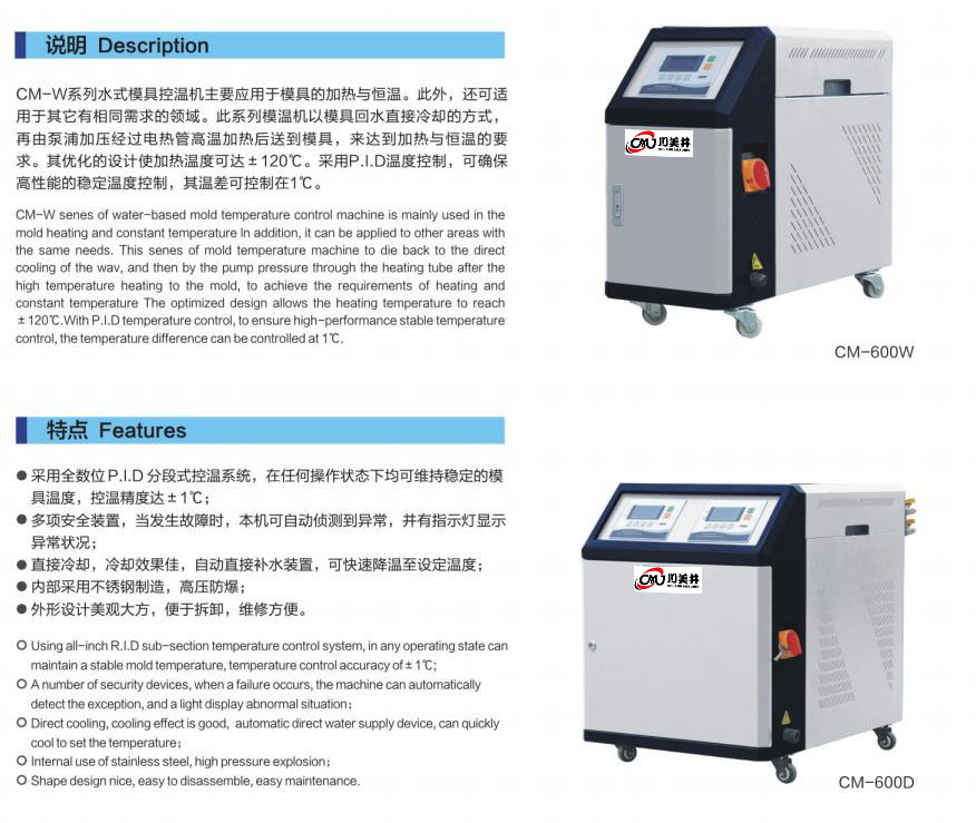 CM-W系列水式模具控溫機主要應用于模具的加熱與恒溫。此外,還可適用于其它有相同需求的領域。此系列模溫機以模具回水直接冷卻的方式,再由泵浦加壓經過電熱管高溫加熱后送到模具,來達到加熱與恒溫的要求。其優(yōu)化的設計使加熱溫度可達±120℃。采用P.I.D溫度控制,可確保高性能的穩(wěn)定溫度控制,其溫差可控制在1℃。
