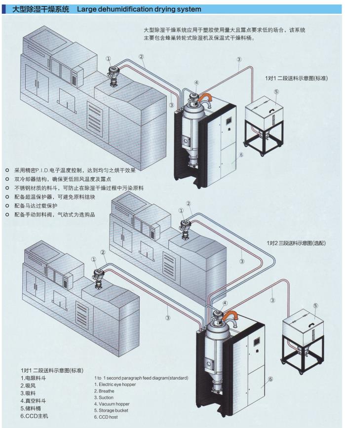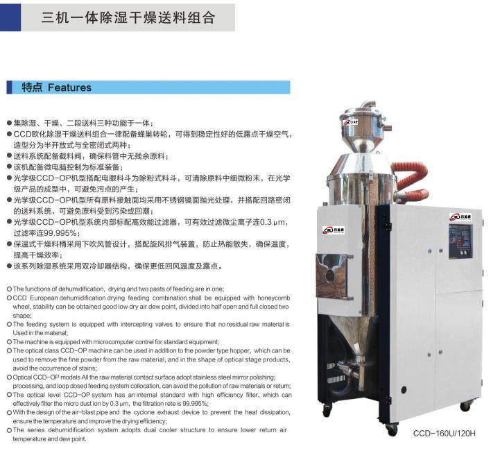集除濕、干燥、二段送料三種功能于一體; CCD歐化除濕干燥送料組合一律配備蜂巢轉(zhuǎn)輪,可得到穩(wěn)定性好的低露點干燥空氣,造型分為半開放式與全密閉式兩種;